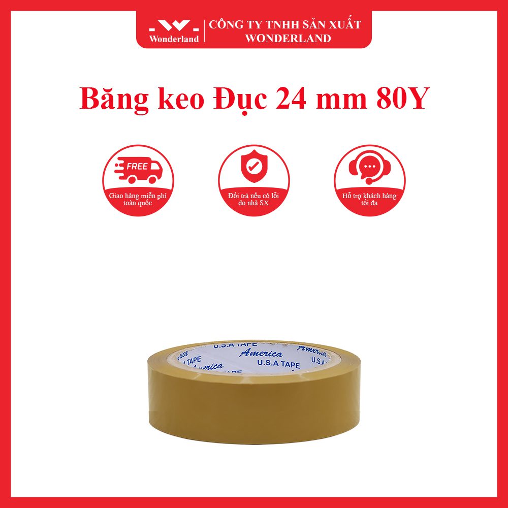 - Kích thước: Với chiều rộng 24 mm và chiều dài 80 yard, băng keo đục Wonderland là lựa chọn lý tưởng cho việc đóng gói và niêm phong các loại thùng carton và bao bì lớn.