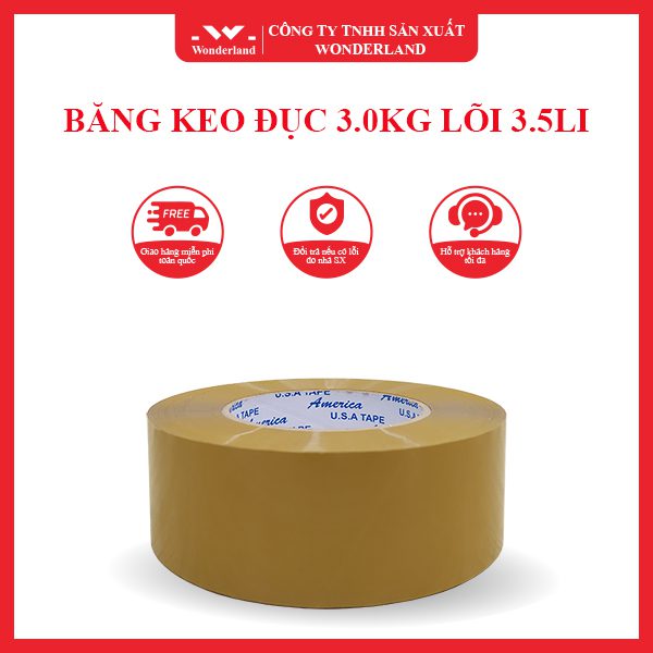 Ngoài băng keo đục 3kg lõi 3.5li, Wonderland còn sản xuất các loại băng keo trong, băng keo màu, băng keo in chữ, màng PE, túi PP… theo yêu cầu.