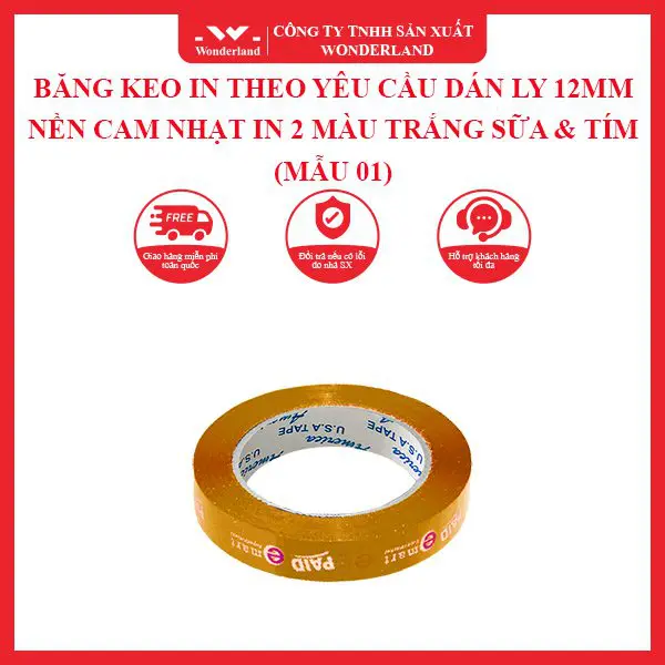 VÌ SAO NÊN ĐẶT HÀNG BĂNG KEO IN THEO YÊU CẦU DÁN LY 12MM NỀN CAM NHẠT IN 2 MÀU TRẮNG SỮA & TÍM (MẪU 01) Ở WONDERLAND?