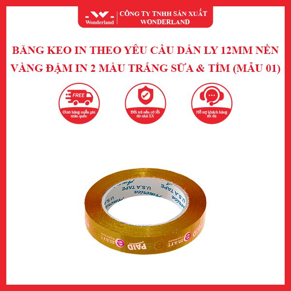 LỢI ÍCH KHI ĐẶT HÀNG BĂNG KEO IN THEO YÊU CẦU DÁN LY 12MM NỀN VÀNG ĐẬM IN 2 MÀU TRẮNG SỮA & TÍM (MẪU 01) TẠI CÔNG TY WONDERLAND