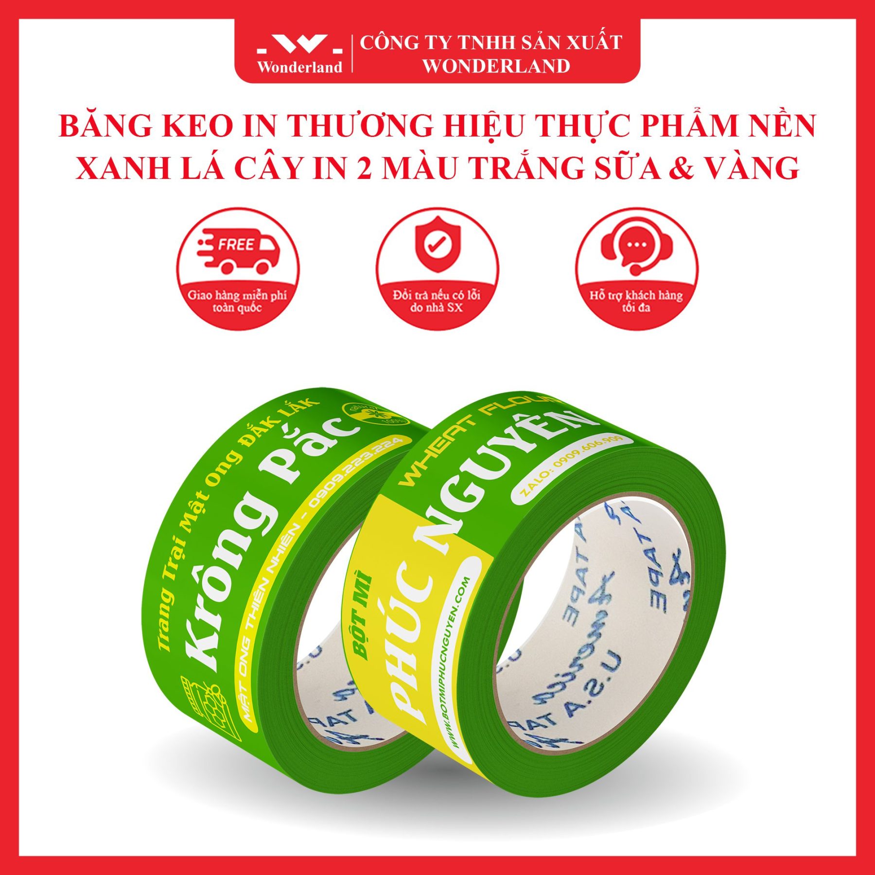 VÌ SAO NÊN ĐẶT HÀNG BĂNG KEO IN THƯƠNG HIỆU THỰC PHẨM NỀN XANH LÁ CÂY IN 2 MÀU TRẮNG SỮA & VÀNG TẠI CÔNG TY WONDERLAND