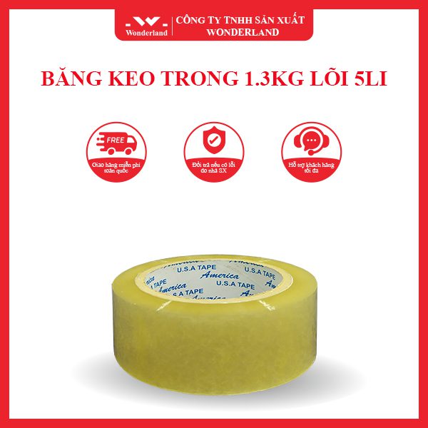 Ngoài băng keo trong 1.3kg lõi 5li, Wonderland còn sản xuất băng keo đục, băng keo in chữ/logo, màng PE…