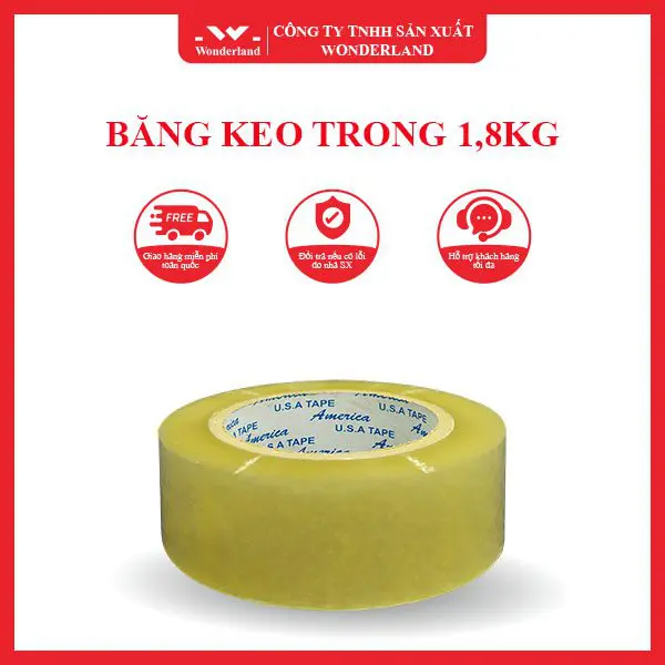- Băng keo trong 1,8kg thông thường là loại băng keo trong dán thùng có quy cách phổ biến là 48mm mà chúng ta đã được biết. Điểm khác biệt duy nhất ở đây là về cách thức mua hàng. Cụm từ “1,8kg” là trọng lượng sản phẩm của hình thức bán hàng theo ký từ nhà sản xuất WONDERLAND – chuyên gia cung cấp giải pháp cho ngành đóng gói hàng đầu tại TPHCM.