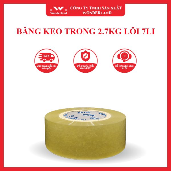 Công ty Wonderland là nhà sản xuất băng keo có nhiều uy tín tại thành phố Hồ Chí Minh. Tại đây được đầu tư nhiều về công nghệ sản xuất, trang bị máy móc hiện đại cùng quy trình sản xuất được tối ưu qua nhiều năm nên băng dính trong 2.7kg lõi 7li được chúng tôi làm ra luôn đáp ứng những tiêu chuẩn khắc khe nhất về chất lượng cùng giá bán sỉ rẻ hơn những công ty thương mại từ 10% đến 20%.