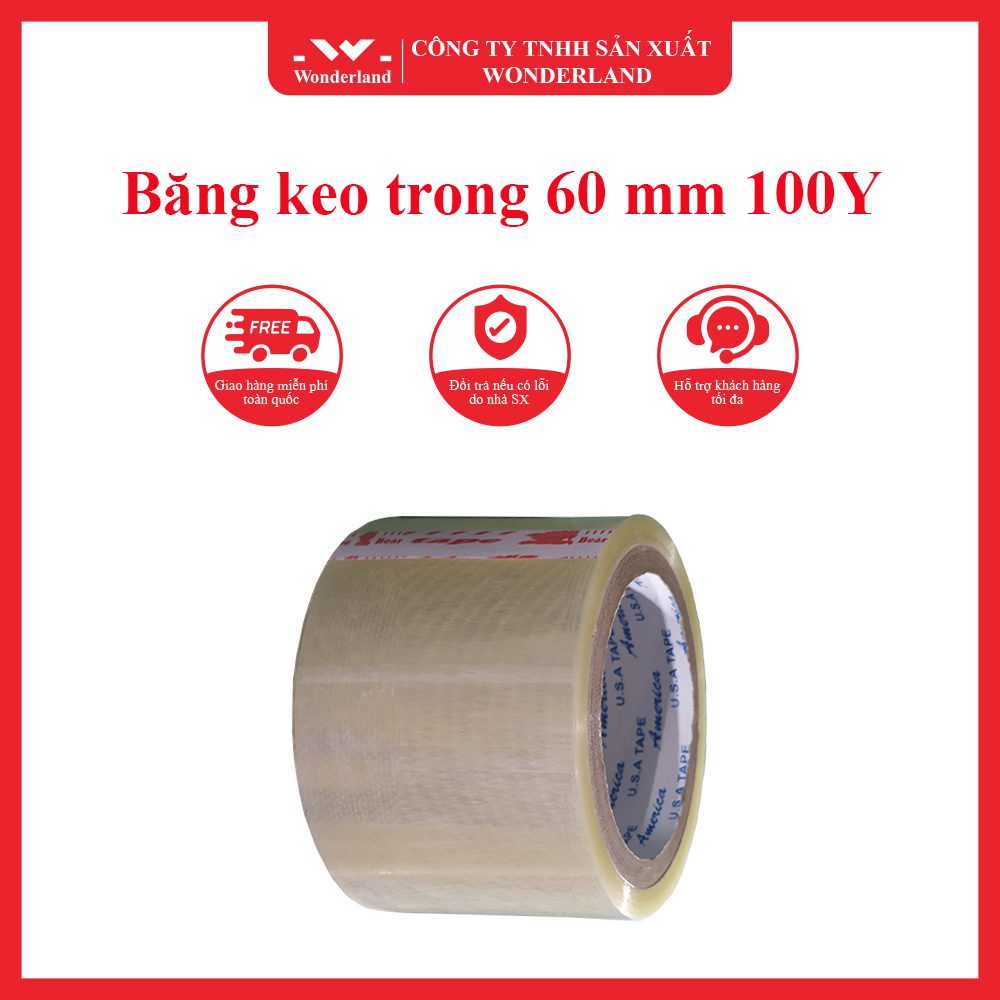 Băng keo trong 60mm x 100y tại Wonderland chuyên dùng đóng gói hàng hóa, bảo quản kiện hàng chắc chắn.