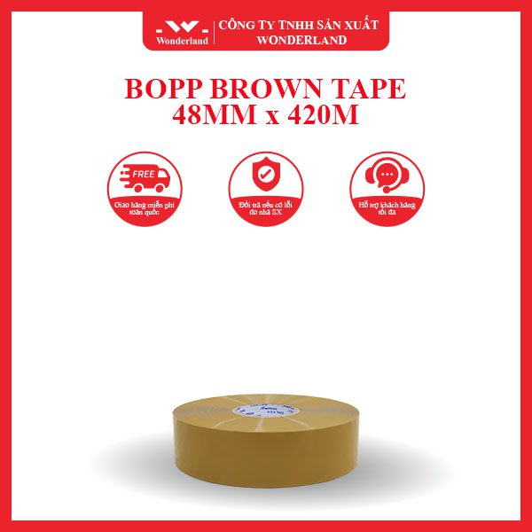In addition to BOPP brown tape 48mm x 420m, Wonderland also provides other BOPP brown tape in various dimensions based on customer’s demands. Please contact us via phone number below to order the product as per your requirement.