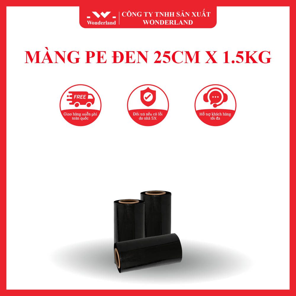 Màng Pe đen 25cm x 1.5kg được biết đến với những tên gọi thông dụng khác như: màng co đen, màng chít đen, màng bọc hàng, màng quấn pallet. Chúng được làm từ nhựa nguyên sinh 100%, bao gồm phần lõi giấy cứng và lớp màng PE được quấn xung quanh.